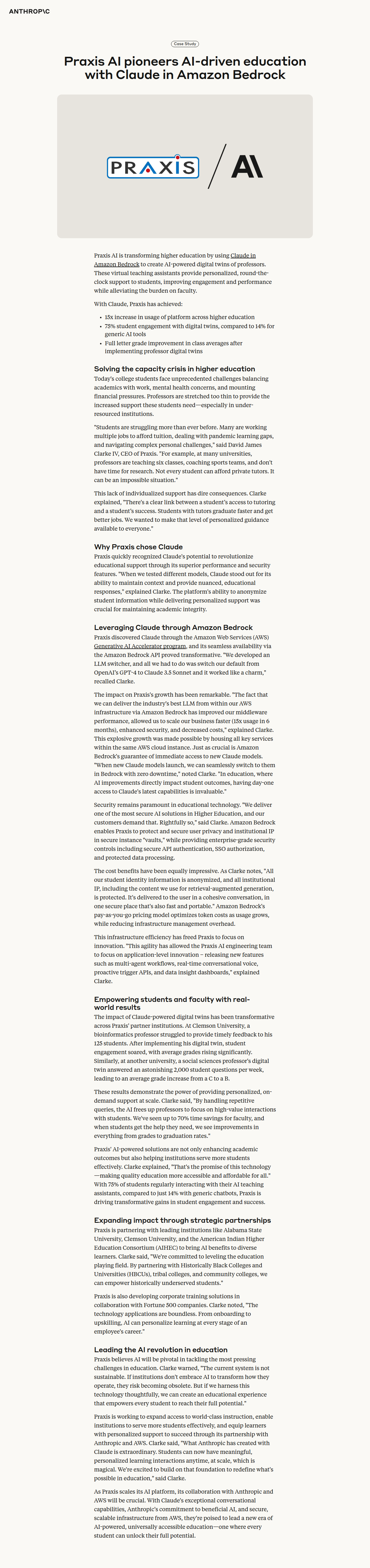 This implementation demonstrates how Praxis AI middleware enables flexible, on-demand learning in business, leadership, and technology developed with DeVry's expert faculty. The AI assistance strategy allows working professionals to upskill seamlessly with courses that integrate into their busy lives, culminating in digital badges that showcase verified competencies valued in today's job market.